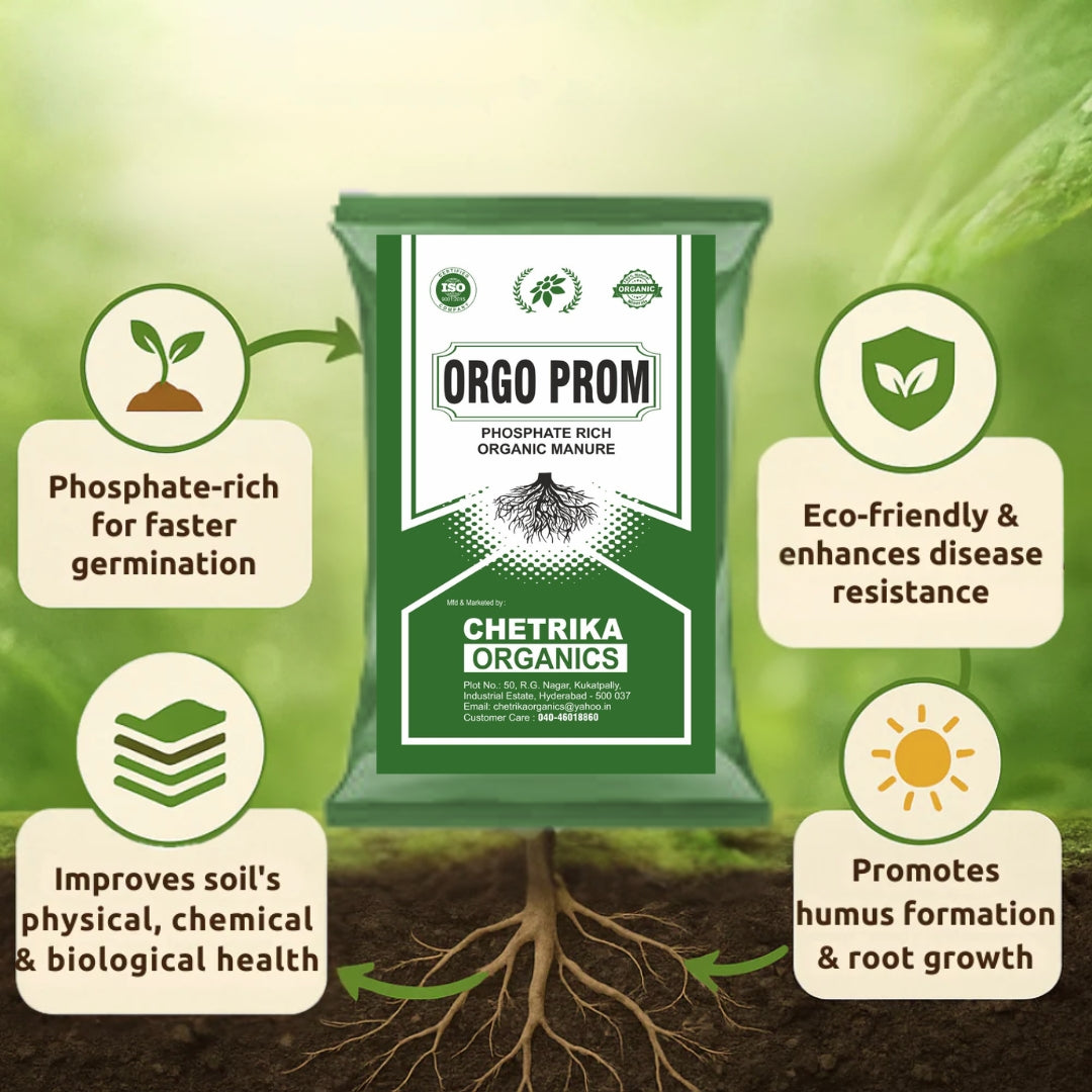 Orgo Prom is a premium organic manure enriched with phosphate to support optimal plant growth. It aids in humus formation, reduces soil alkalinity, strengthens disease resistance, and increases the availability of essential nutrients. By improving soil structure and fertility, PROM PLUS ensures better germination, robust plant development, and higher agricultural productivity.